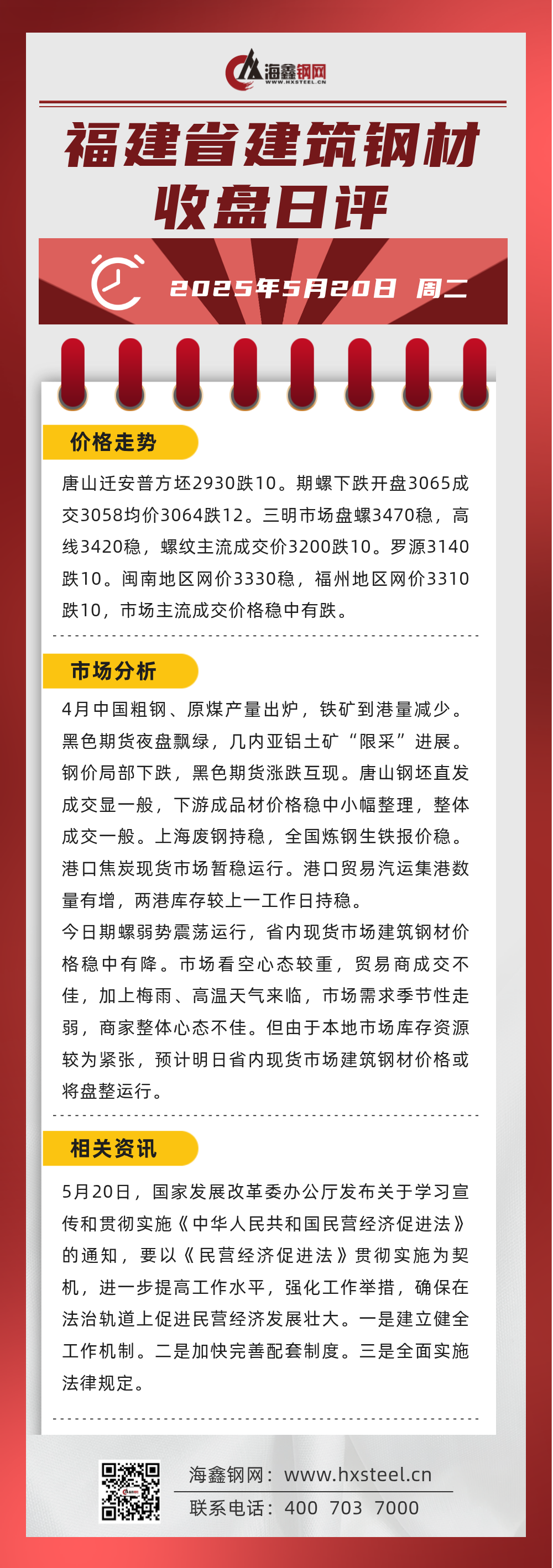 5月20日福建省內(nèi)建筑鋼材收盤日評(píng)