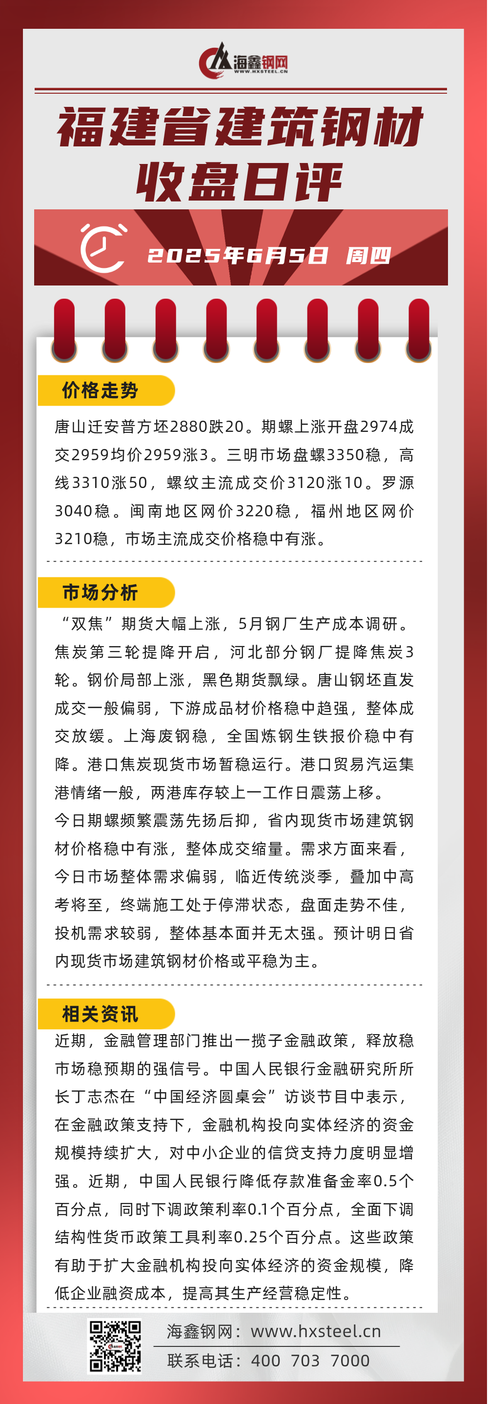 6月5日福建省內(nèi)建筑鋼材收盤日評
