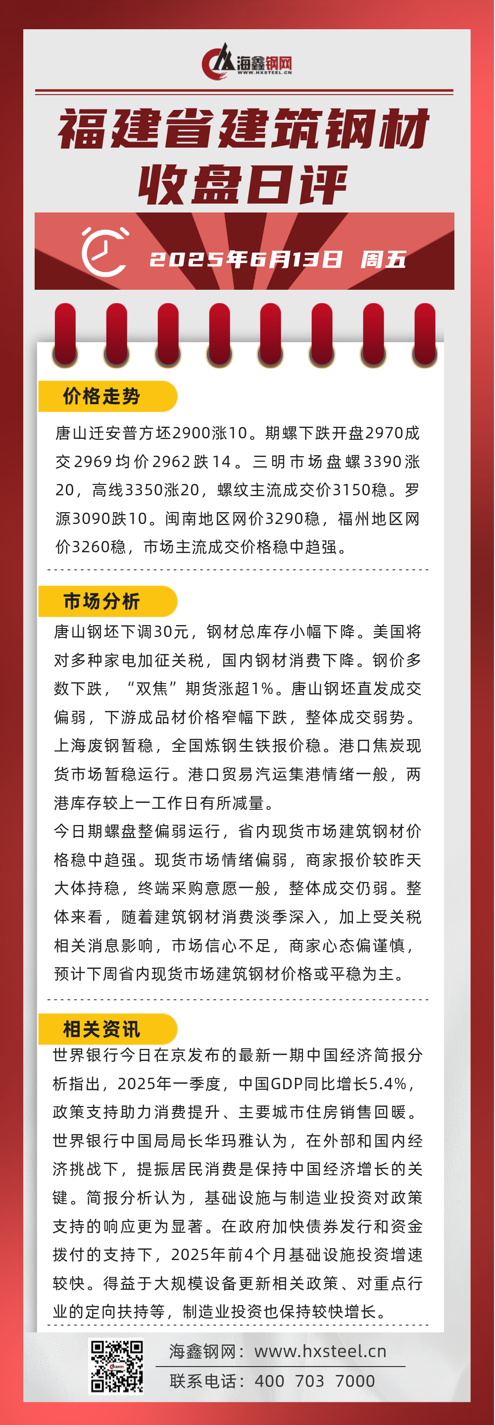 6月13日福建省內建筑鋼材收盤日評