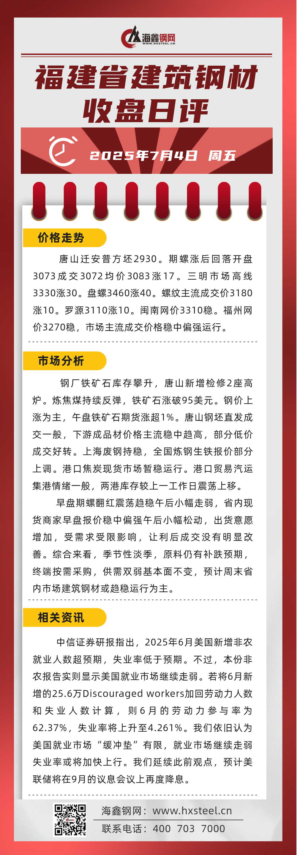 7月4日福建省內(nèi)建筑鋼材收盤日評