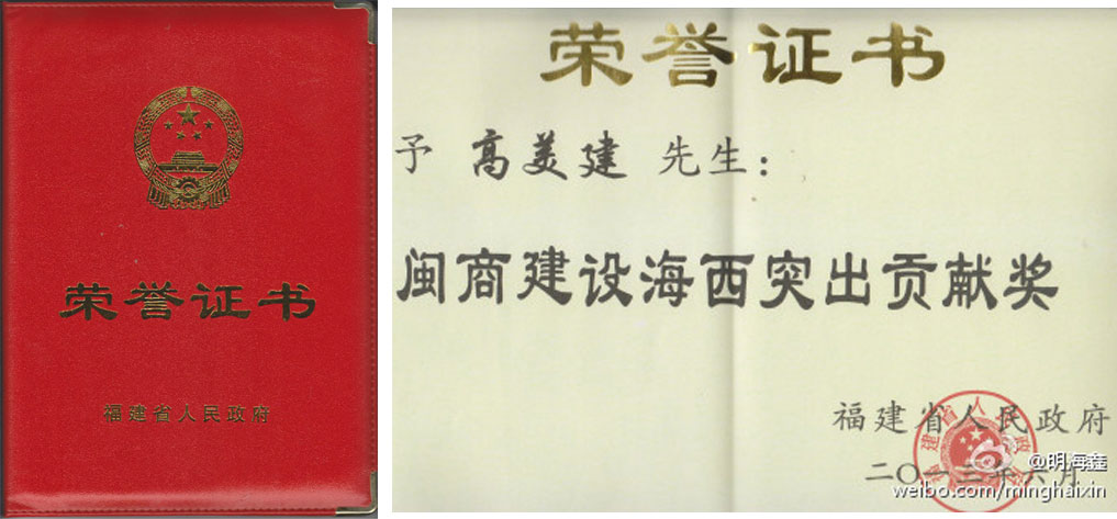近日,福建省人民政府發出《關于表彰閩商建設海西作出突出貢獻獎的決定》( 閩政文〔2013〕215號),表彰廣大閩商為海峽西岸經濟區建設作出的積極貢獻,全省共有238位非公有制經濟人士獲得“閩商建設海西作出突出貢獻獎”。其中福建明海鑫企業股份有限公司董事長高美建先生獲此榮譽。